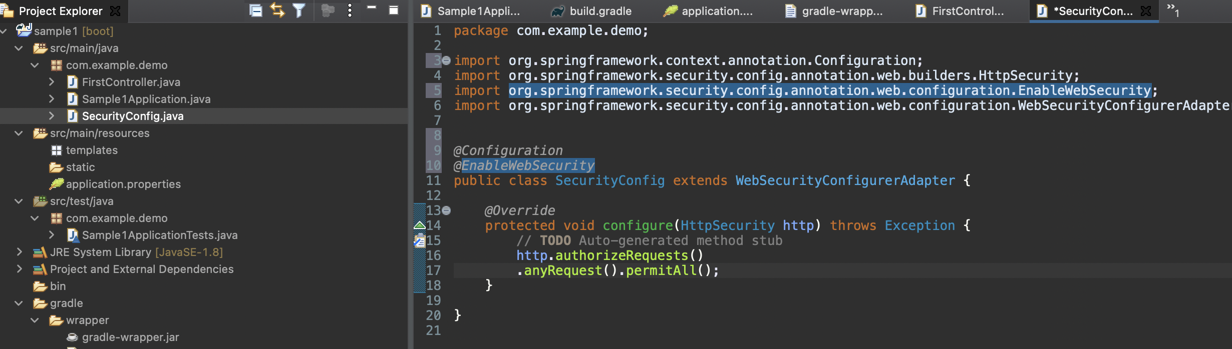 spring Security 관련 클래스를 하나 생성하여 모든 리퀘스트에 대한 퍼미션을 주도록 위와같이 설정한다.