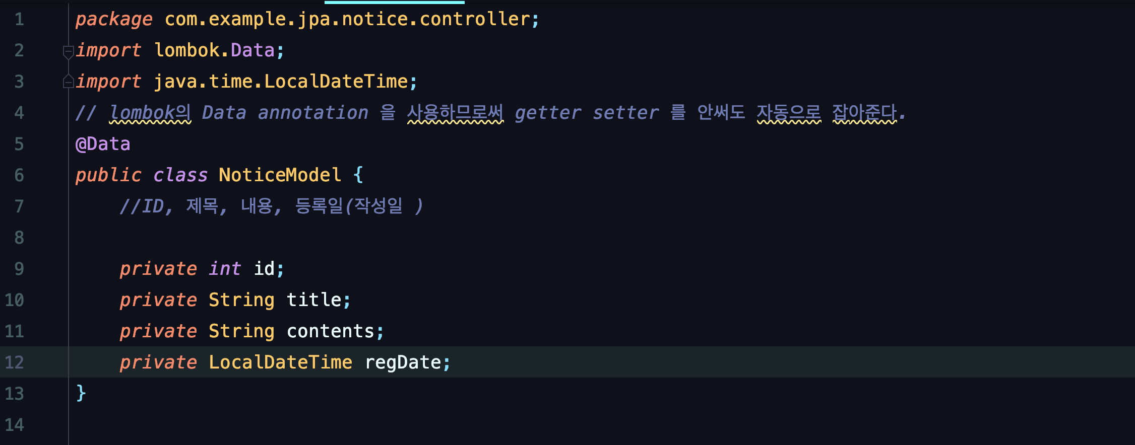 lombok 으로 @data annotation 을 넣으면 getter setter 를 굳이 안 작성해도 자동으로 잡아준다.
