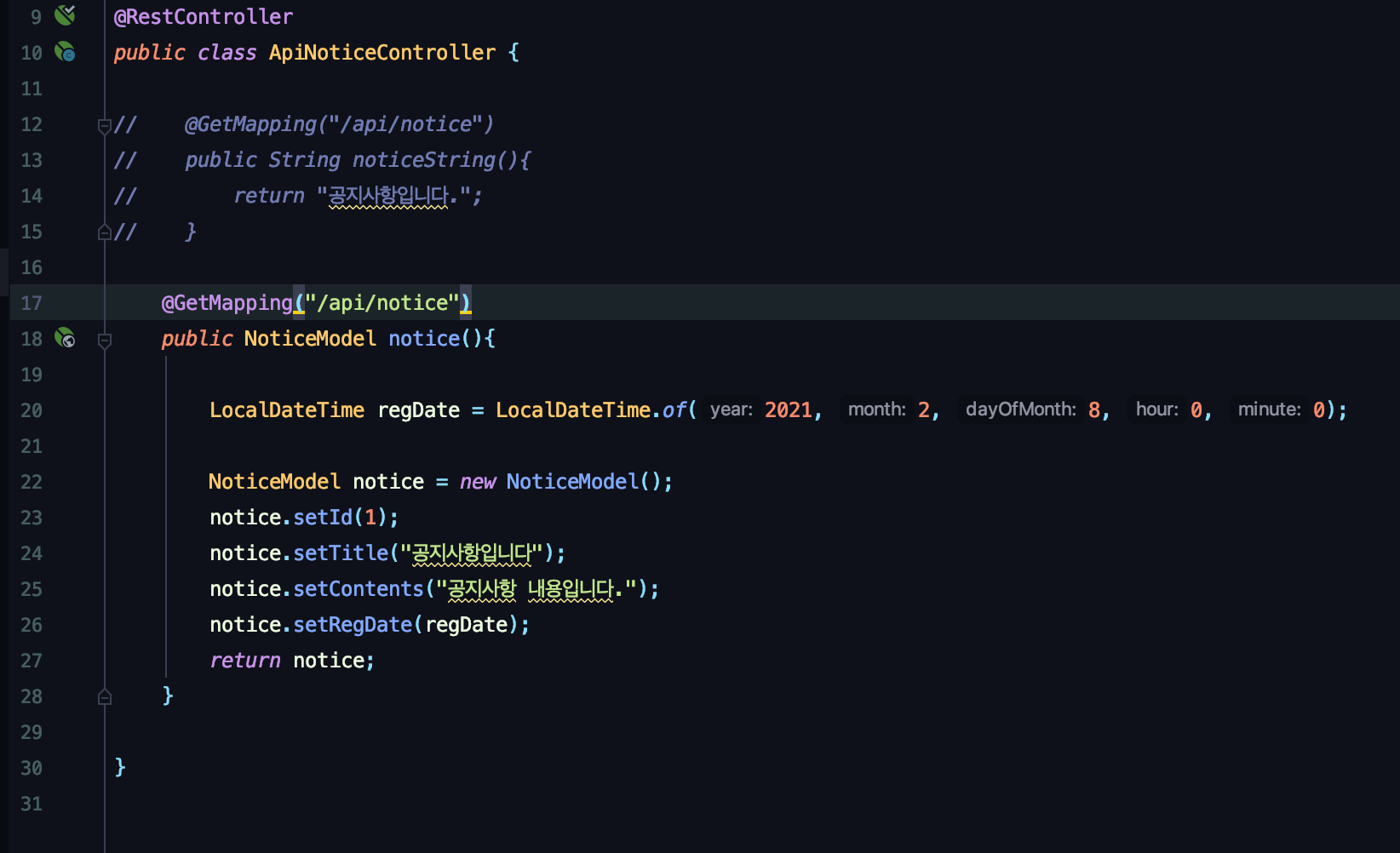 공지사항 데이터 받아줄 모델(객체) 설정한다.