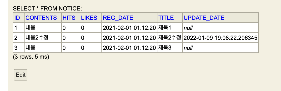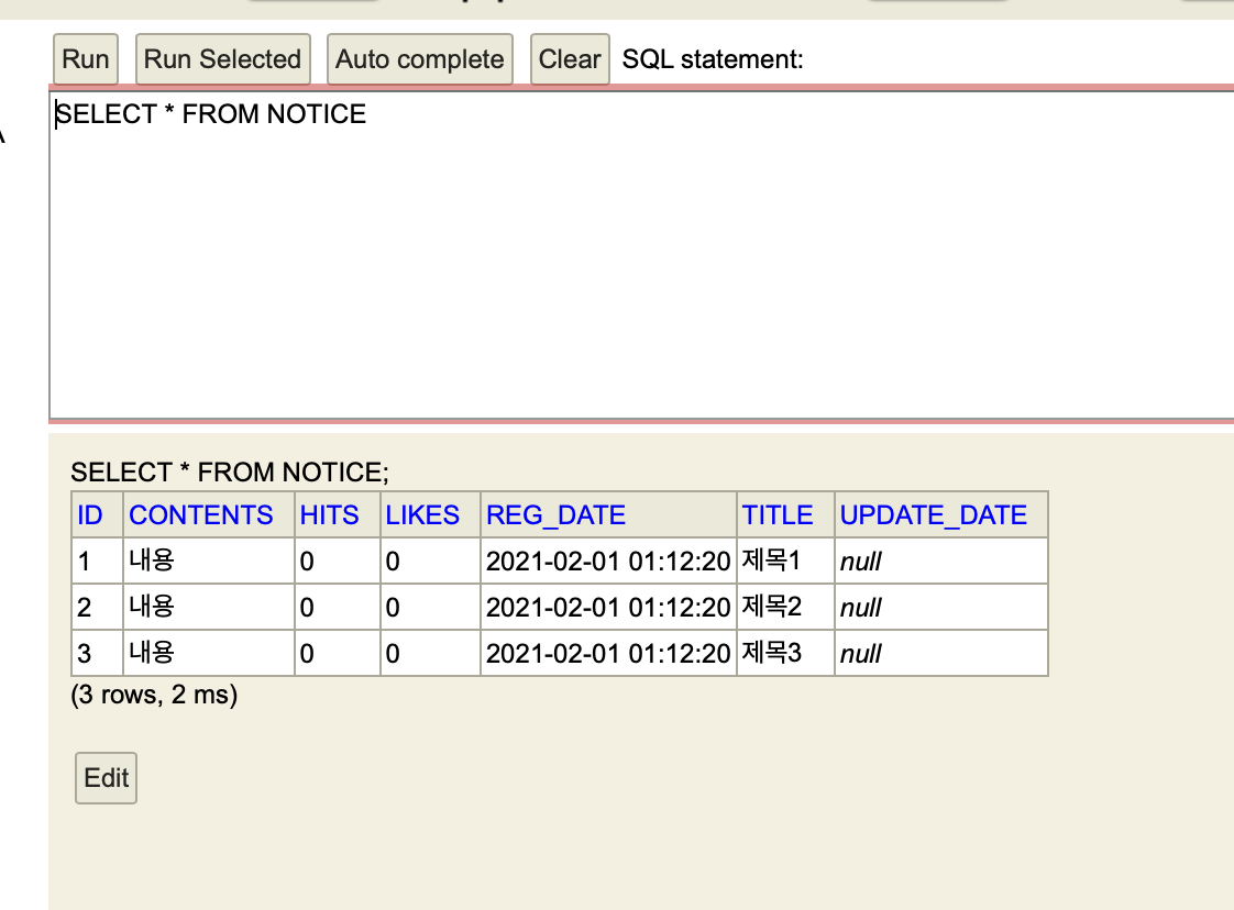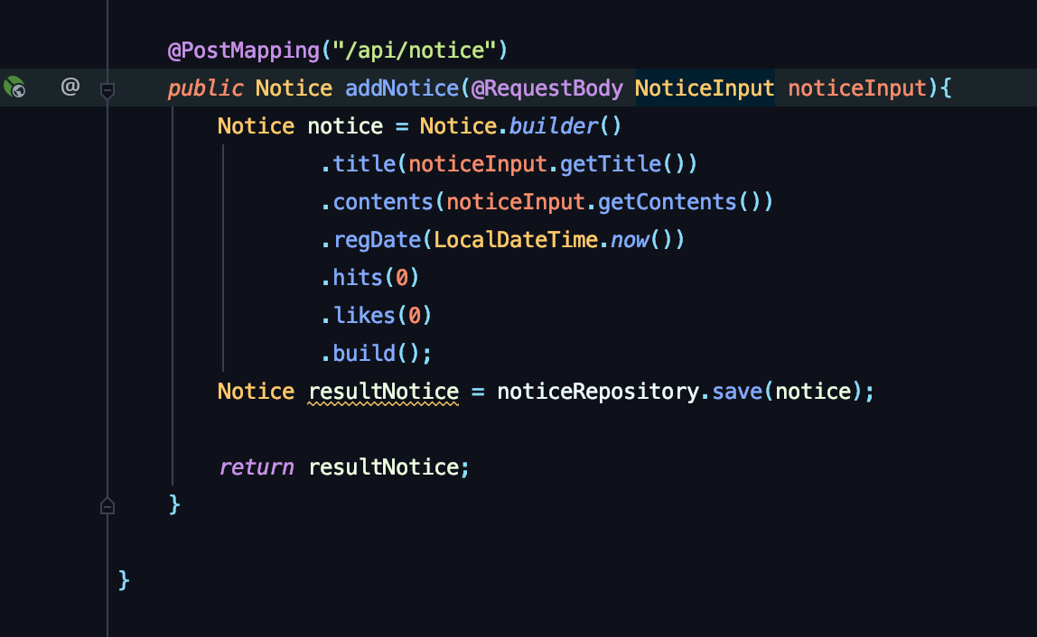jpaRepository를 상속한 noticeRepository에 요청들어온 데이터를 notice 객체로 매핑하여 저장한다.