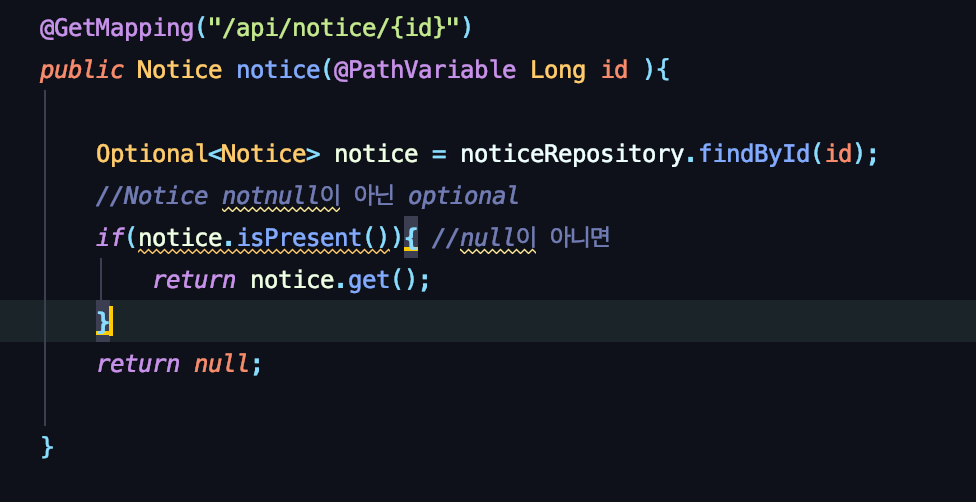 interface 로 JpaRepository를 상속한 noticeRepository에서 id 를 키값으로 데이터객체를 찾는다.