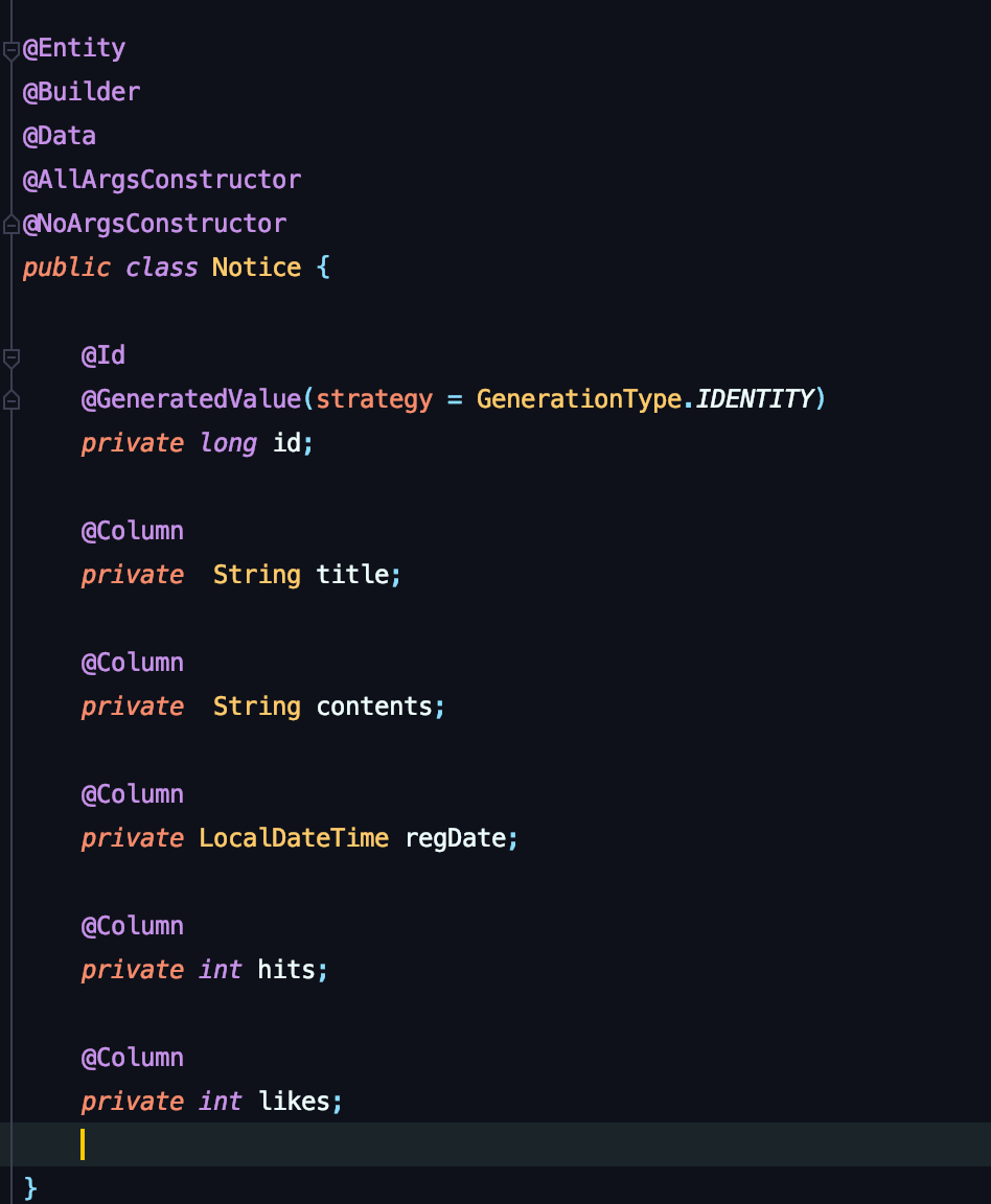 위와 같이 @Column 어노테이션을 붙여서 객체를 정의해준다.