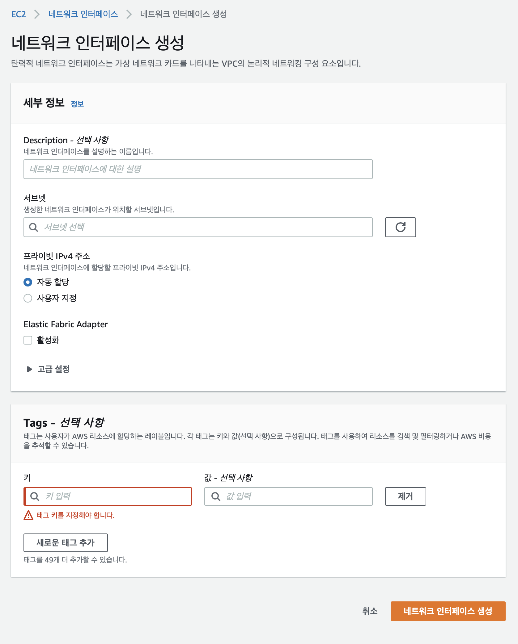 프라이빗 IPv4 주소를 같은 대역으로 아무거나 중복되지 않게 넣는다. (중복이면 얼럿 뜸)