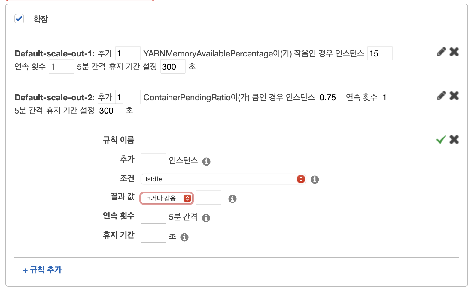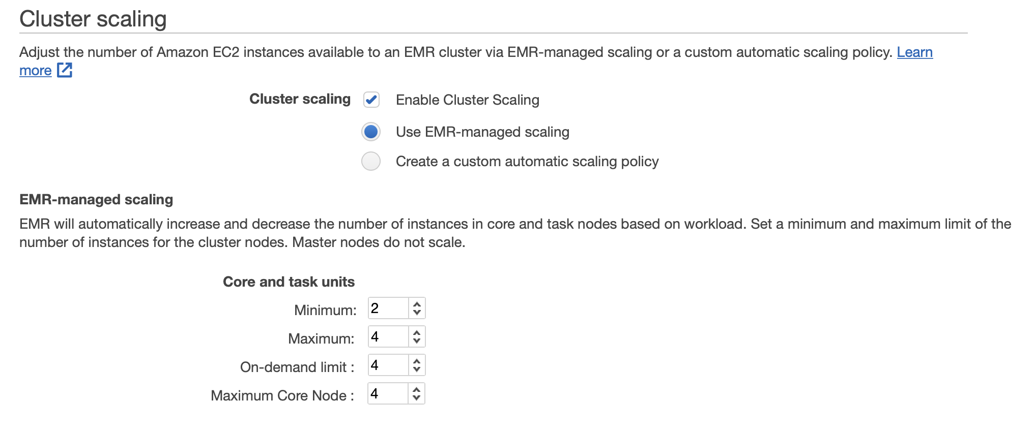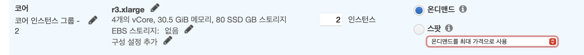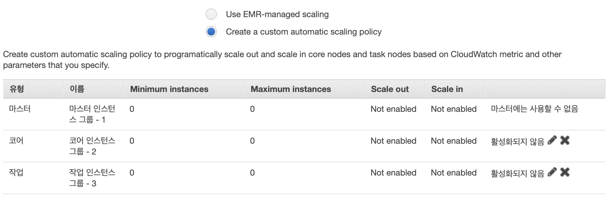 - master 와 core를 하나씩 두고 task 노드를 spot 으로 하여 처리량에 따라 최소 비용으로 scalble 이 가능하도록 auto scaling 을 설정