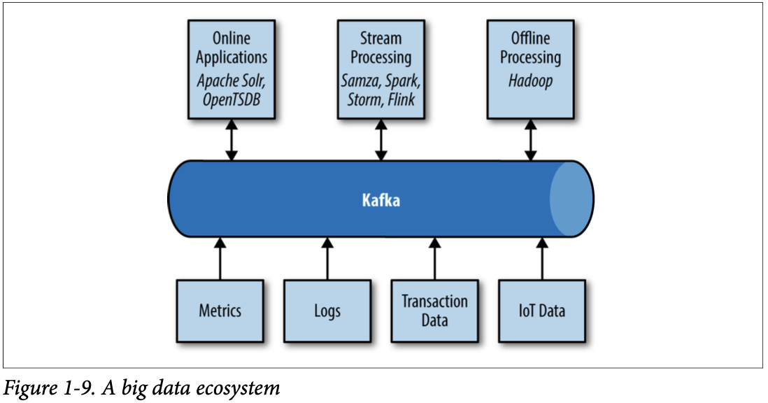 → 여러 종류의 애플리케이션에서 스트림 프로세싱을 지원한다. 일반적으로 하둡의 맵리듀스처리와 유사한 기능을 제공하는 애플리케이션에 활용된다. 하둡은 긴시간 적재된 데이터를 쓰지만, 스트림 프로세싱은 메세지가 생성되자마자 실시간으로 데이터를 처리한다는 점이 다르다.