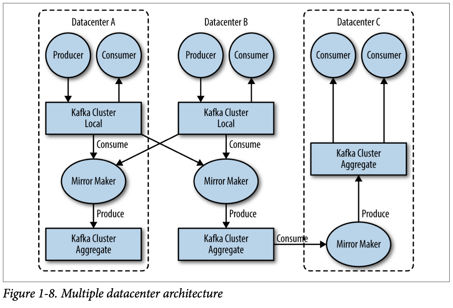 다중 클러스터를 구현하기 위해서 메세지가 데이터센터 간에 복제되어야 한다. 카프카 클러스터의 리플리케이션은 단일 클러스터내에서만 사용가능 하므로 이를 위해서 미러메이커 라는 도구가 포함되어 있다.