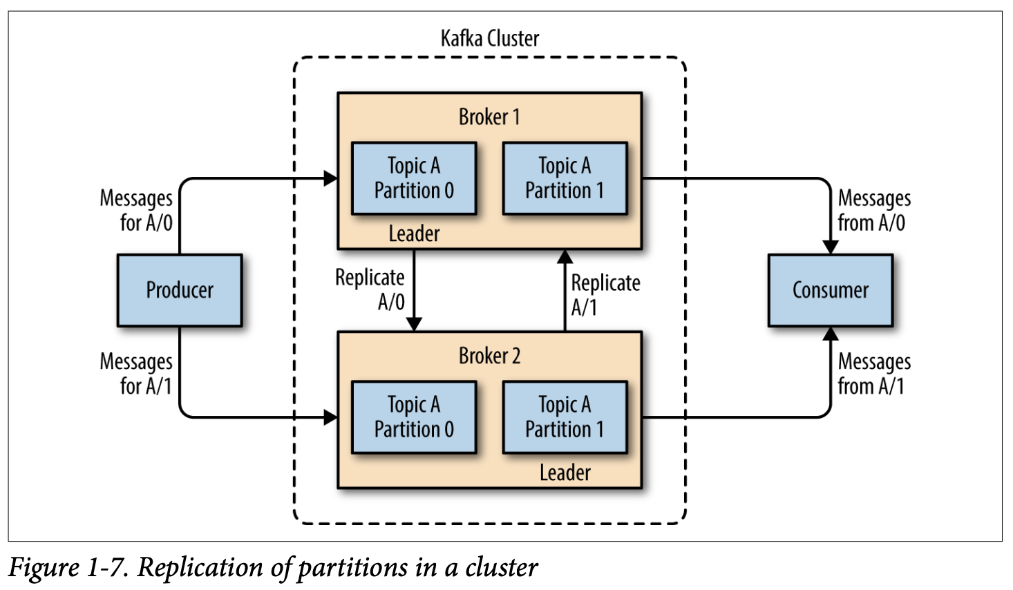 -같은 파티션이 여러 브로커에 할당될 수도 있는데 이때는 파티션이 복제(replication) 된다. 이 경우 파티션의 메세지는 중복 저장되지만 관련 브로커에 문제가 생기면 다른 브로커가 인계받아 그 파티션을 처리할 수 있다.