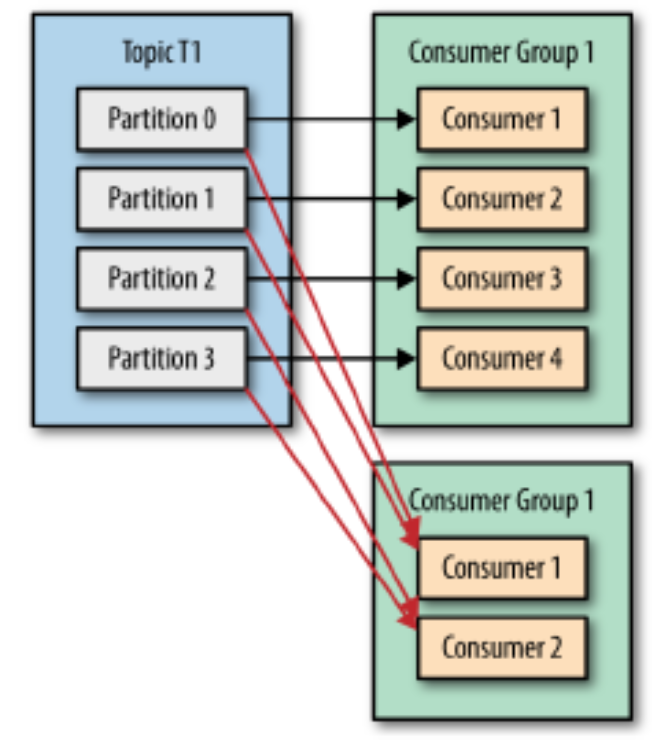 하지만 파티션 입장에서는 각 컨슈머 그룹의 컨슈머 하나에만 보낼 수 있다.